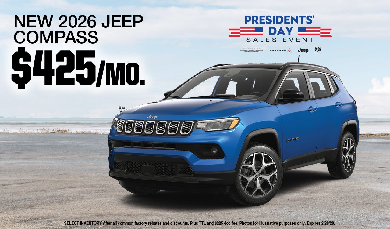 2026 JEEP COMPASS $425 Month #262110, 6.9% for 84 months with TTL & doc fee down. With approved credit. Photos for illustrative purposes only. See dealer for details. Expires 3/2/26.