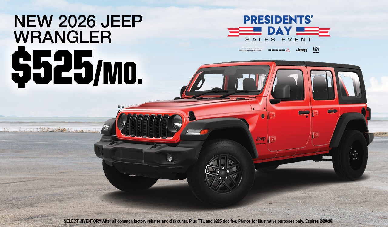 2026 JEEP WRANGLER $525 Month #262205 6.9% for 84 months with TTL & doc down Photos for illustrative purposes only. See dealer for details. Expires 3/2/26.