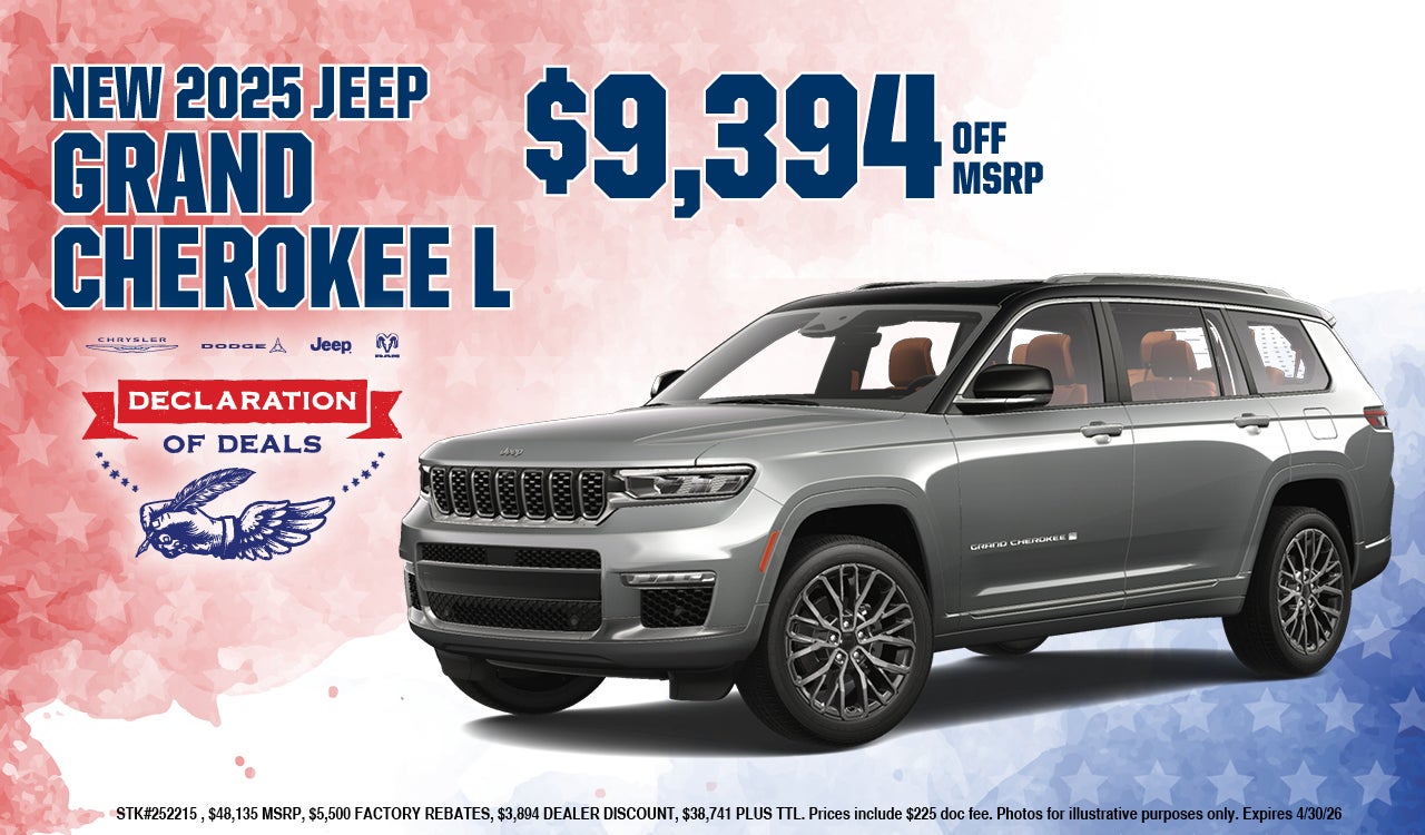New 2025 JEEP GRAND CHEROKEE L $9,394 off MSRP STK#252215 , $48,135 MSRP, $5,500 FACTORY REBATES, $3,894 DEALER DISCOUNT, $38,741 PLUS TTL. Prices include $225 doc fee. Photos for illustrative purposes only. Expires 4/30/26