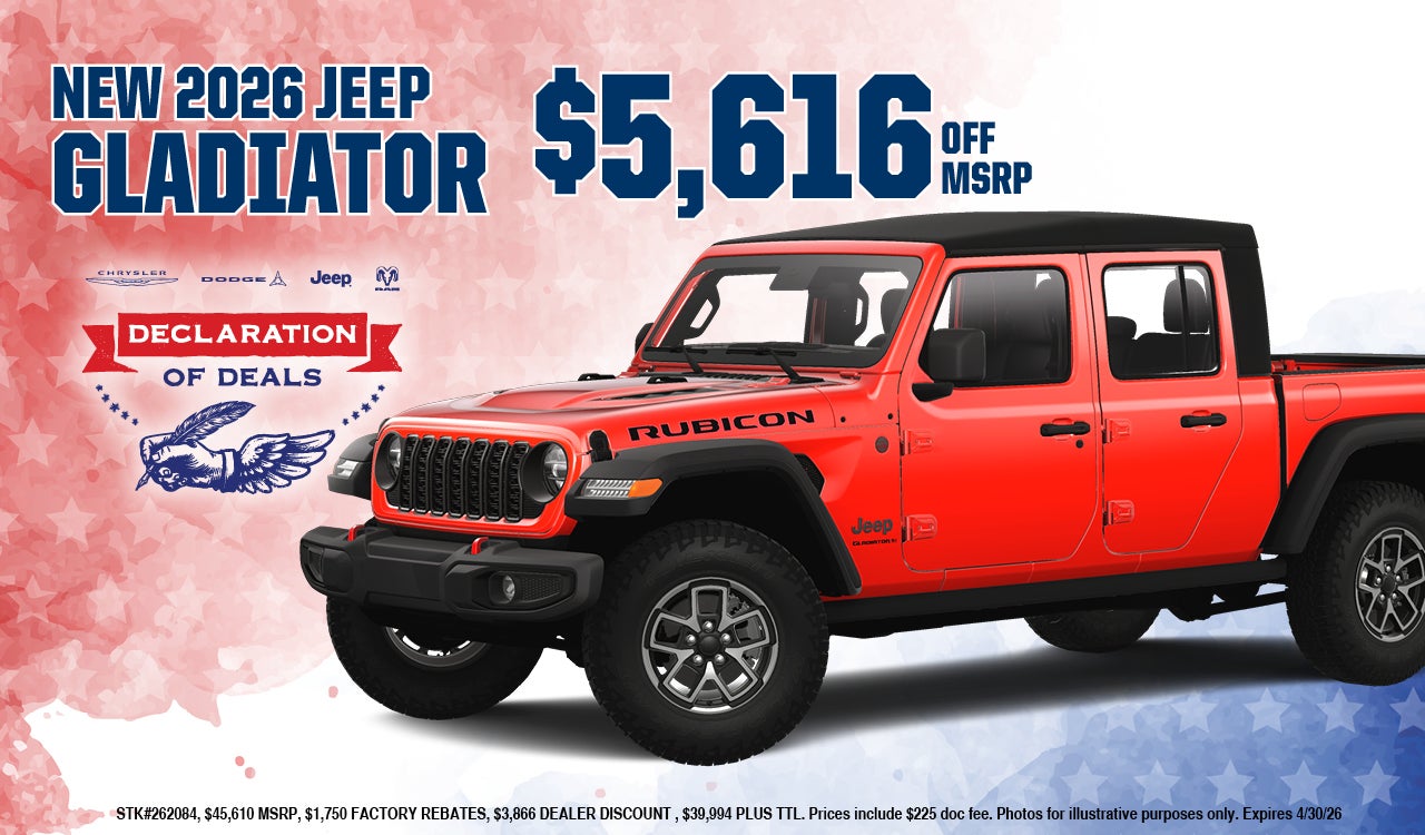 New 2026 JEEP GLADIATOR $5,616 off MSRP STK#262084, $45,610 MSRP, $1,750 FACTORY REBATES, $3,866 DEALER DISCOUNT , $39,994 PLUS TTL. Prices include $225 doc fee. Photos for illustrative purposes only. Expires 4/30/26