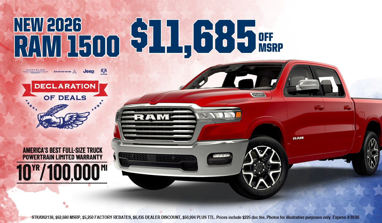 New 2026 RAM 1500 $11,685 off MSRP STK#262138, $62,680 MSRP, $5,250 FACTORY REBATES, $6,435 DEALER DISCOUNT, $50,994 PLUS TTL. Prices include $225 doc fee. Photos for illustrative purposes only. Expires 4/30/26