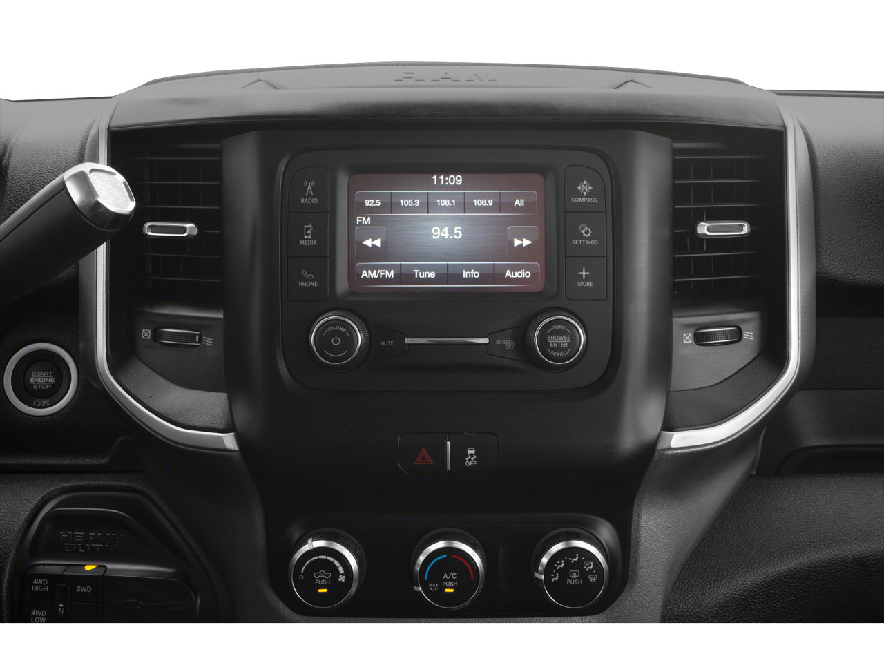 Heated Seats & Wheel Group (Heated Front Seats, Heated Steering Wheel, Leather Wrapped Steering Wheel, and Steering Wheel Mounted Audio Controls), Level 1 Equipment Group (2 Way Rear Headrest Seat, 2nd Row In Floor Storage Bins, 4 Way Front Headrests, 40/20/40 Split Bench Seat, 8.4 Touchscreen Display, Apple CarPlay, Auto-Dimming Rear-View Mirror, Center Hub, Center Stack Storage Drawer, Cluster 3.5 TFT Color Display, Dual Glove Boxes, Foam Bottle Insert (Door Trim Panel), Folding Flat Load Floor Storage, Footwell Courtesy Lamp, For More Info, Call 800-643-2112, Front Armrest w/Cupholders, Front Center Seat Cushion Storage, Front Fog Lamps, Front Seat Back Map Pockets, Glove Box Lamp, Google Android Auto, GPS Antenna Input, Integrated Center Stack Radio, Integrated Voice Command w/Bluetooth®, Locking Lower Glove Box, Manual Adjust 4-Way Front Passenger Seat, Power 2-Way Driver Lumbar Adjust, Power Adjust 8-Way Driver Seat, Power Adjust/Fold & Heated Black Tow Mirrors, Power Adjustable Pedals, Power Folding Mirrors, Premium Cloth 40/20/40 Bench Seat, Radio: Uconnect 4 w/8.4 Display, Rear 60/40 Folding Seat, Rear Dome w/On/Off Switch Lamp, SiriusXM Radio Service, SiriusXM Satellite Radio, Sun Visors w/Illuminated Vanity Mirrors, Universal Garage Door Opener, USB Host Flip, and Wheels: 18 x 8.0 Polished Aluminum), Off Road Package (Front Performance Tuned Shock Absorbers, Hill Descent Control, Off Road Decal, Rear Performance Tuned Shock Absorbers, and Tow Hooks), Protection Group, Quick Order Package 2HY Lone Star (Regional) (Lone Star Badge), 1-Year SiriusXM Guardian Trial, 20 x 8.0 Polished Aluminum Wheels, 220 Amp Alternator, 3.73 Axle Ratio, 4-Wheel Disc Brakes, 5-Year SiriusXM Traffic Service, 5-Year SiriusXM Travel Link Service, 5th Wheel/Gooseneck Towing Prep Group, 6 Speakers, 9 Alpine Speakers w/Subwoofer, ABS brakes, Active Noise Control System, Air Conditioning, Air Conditioning ATC w/Dual Zone Control, AM/FM radio, Anti-Spin Differential Rear Axle, Brake assist, Bumpers: chrome, Clearance Lamps, Cloth 40/20/40 Bench Seat, Compass, Delay-off headlights, Disassociated Touchscreen Display, Driver door bin, Dual front impact airbags, Dual front side impact airbags, Electronic Stability Control, Electronically Controlled Throttle, For Details Visit DriveUconnect.com, Front & Rear Rubber Floor Mats, Front anti-roll bar, Front Center Armrest w/Storage, Front reading lights, Fully automatic headlights, GPS Navigation, HD Radio, Heated door mirrors, I/P Mounted Auxiliary Switches, Illuminated entry, LED Bed Lighting, Low tire pressure warning, Manual Adjust 4-Way Driver Seat, Occupant sensing airbag, Outside temperature display, Overhead airbag, Overhead console, Panic alarm, ParkSense Rear Park Assist System, ParkView Rear Back-Up Camera, Passenger door bin, Passenger vanity mirror, Power door mirrors, Power steering, Power windows, Radio data system, Radio: Uconnect 3 w/5 Display, Radio: Uconnect 4C Nav w/8.4 Display, Rear anti-roll bar, Rear Folding Seat, Rear seat center armrest, Rear step bumper, Rear Window Defroster, Remote keyless entry, SiriusXM Traffic Plus, SiriusXM Travel Link, Speed control, Spray In Bedliner, Tachometer, Tilt steering wheel, Tip Start, Traction control, Trip computer, Turn signal indicator mirrors, Variably intermittent wipers, Vendor Painted Cargo Box Tracking, Voltmeter, and Wheels: 18 x 8.0 Steel Chrome ClaD.