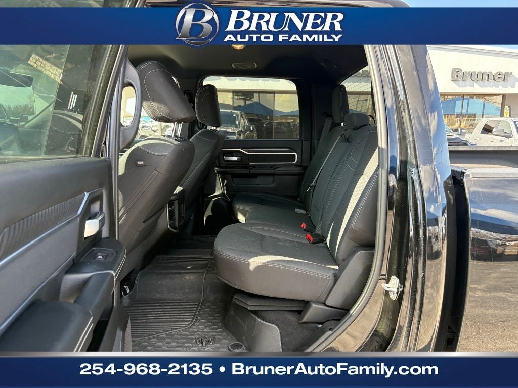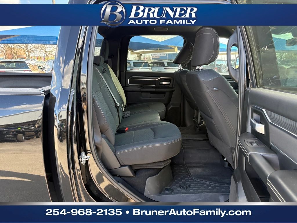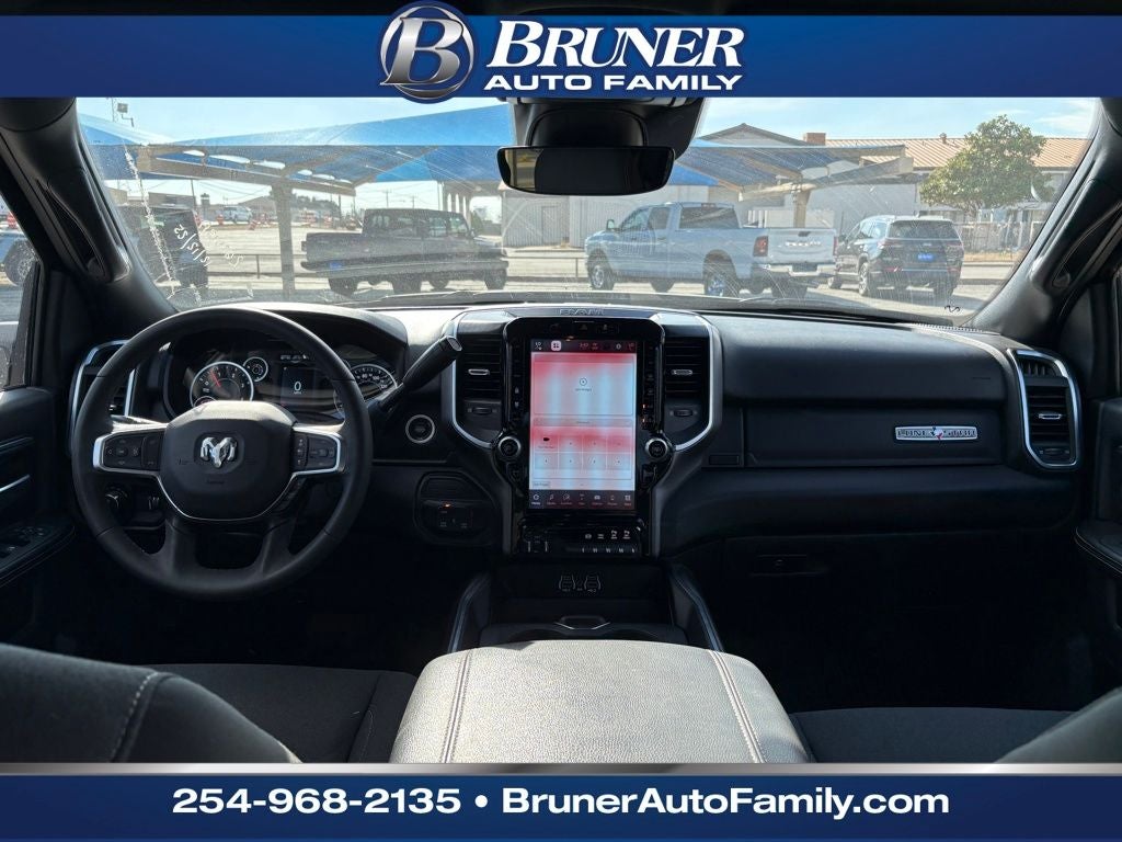 Big Horn Level 1 Plus Equipment Group (12 Touchscreen Display, 2 Way Rear Headrest Seat, 2nd Row In Floor Storage Bins, 4 Way Front Headrests, 40/20/40 Split Bench Seat, 4G LTE Wi-Fi Hot Spot, 9 Alpine Speakers w/Subwoofer, Air Conditioning ATC w/Dual Zone Control, Alexa Built-In, Anti-Spin Differential Rear Axle, Apple CarPlay, Auto Power-Folding Mirrors, Auto-Dimming Rear-View Mirror, Black Exterior Mirrors, Connected Travel & Traffic Services, Connectivity - US/Canada, Dual Glove Boxes, Emergency Vehicle Alert System (EVAS), Exterior Mirrors Courtesy Lamps, Exterior Mirrors w/Heating Element, Exterior Mirrors w/Supplemental Signals, Foam Bottle Insert (Door Trim Panel), Folding Flat Load Floor Storage, Footwell Courtesy Lamp, Forward & Reverse Utility Lights, Front Armrest w/Cupholders, Front Center Seat Cushion Storage, Front Seat Back Map Pockets, Global Telematics Box Module (TBM), Glove Box Lamp, Google Android Auto, GPS Antenna Input, GPS Navigation, HD Radio, Integrated Voice Command w/Bluetooth®, LED Bed Lighting, Locking Lower Glove Box, Luxury Steering Wheel, Manual Adjust 4-Way Front Passenger Seat, Mirror Running Lights, MOPAR Deployable Bed Step, MOPAR Spray In Bedliner, Off-Road Info Pages, Power 2-Way Driver Lumbar Adjust, Power Adjust 8-Way Driver Seat, Power Adjust Mirrors, Power Adjustable Convex Aux Mirrors, Power Heated Folding Telescopic Mirrors, Power Telescoping Mirrors, Premium Cloth 40/20/40 Bench Seat, Radio: Uconnect 5 Nav w/12.0 Display, Rear 60/40 Folding Seat, Rear Dome w/On/Off Switch Lamp, Remote Start System, Remote USB Port - Charge Only, Selectable Tire Fill Alert, SiriusXM Radio Service, SiriusXM w/360L, Steering Wheel Mounted Audio Controls, Storage Tray, and Trailer Tow Pages), Heated Seats & Wheel Group (Heated Front Seats and Heated Steering Wheel), Night Edition (Black Exterior Truck Badging, Black Interior Accents, Black Wheel Center Hub, Body Color Grille Surround, Gloss Black Nostrils/Mic Black Grille, Painted Front Bumper, Painted Rear Bumper, and Wheels: 20 x 8.0 Black Painted Aluminum), Quick Order Package 24Y Lone Star (Regional) (Lone Star Badge), 4-Wheel Disc Brakes, 5th Wheel/Gooseneck Towing Prep Group, 6 Speakers, ABS brakes, Air Conditioning, Alloy wheels, AM/FM radio: SiriusXM, Apple CarPlay/Android Auto, Brake assist, Bumpers: chrome, Clearance Lamps, Cloth 40/20/40 Bench Seat, Compass, Delay-off headlights, Driver door bin, Dual front impact airbags, Dual front side impact airbags, Electronic Stability Control, Front anti-roll bar, Front Center Armrest w/Storage, Front fog lights, Front License Plate Bracket, Front reading lights, Fully automatic headlights, Heated door mirrors, Illuminated entry, Low tire pressure warning, Manual Adjust 4-Way Driver Seat, MOPAR Front & Rear Rubber Floor Mats, Occupant sensing airbag, Outside temperature display, Overhead airbag, Overhead console, Panic alarm, ParkView Rear Back-Up Camera, Passenger door bin, Passenger vanity mirror, Power door mirrors, Power steering, Power windows, Radio data system, Radio: Uconnect 5 w/8.4 Display, Rear anti-roll bar, Rear Folding Seat, Rear seat center armrest, Rear step bumper, Rear window defroster, Remote keyless entry, Security system, Speed control, Tachometer, Tilt steering wheel, Traction control, Trip computer, Turn signal indicator mirrors, Variably intermittent wipers, Vinyl 2nd Row Seat, Voltmeter, and Wheels: 18 x 8.0 Polished Aluminum.